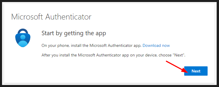 3) After installing the Microsoft Authenticator app on your phone, click Next on the 'Start by getting the app' page.