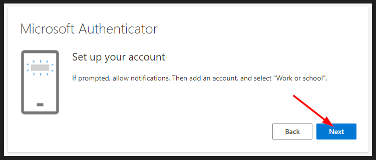 8) This will take you to the 'Scan the QR code' page. Scan the code displayed on your computer with your Microsoft Authenticator app on your phone. After doing so, click Next.