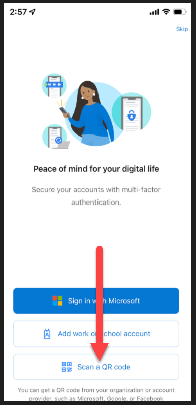 6) Once you reach the screen below on your phone, select Scan a QR Code (you will be prompted to allow camera access). If you do not see this screen, tap the '+' button at the top of the app, then tap 'Work or school account', and then 'Scan a QR code'.